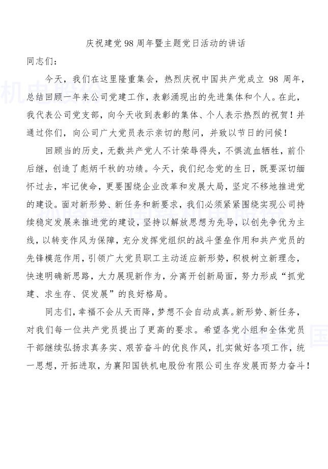 今年是建黨98周年?!捌咭弧鼻昂螅尻枃F機電股份有限公司開展了豐富多彩的紀念活動,以傳承紅色基因、弘揚革命精神,不忘初心、牢記使命,矢志為中華民族偉大復興中國夢努力奮斗。